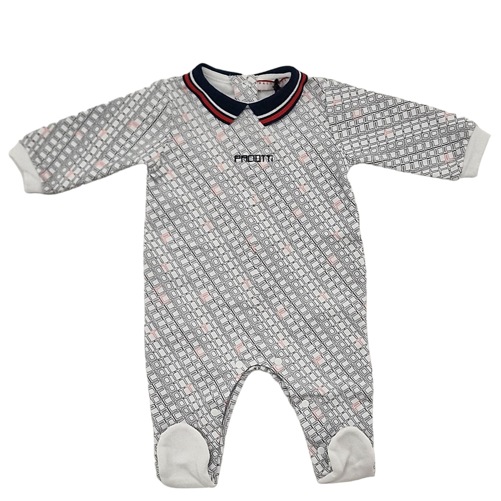 Tutina neonato felpata multi logo, e ricamo paciotti sul davanti con collo a contrasto.